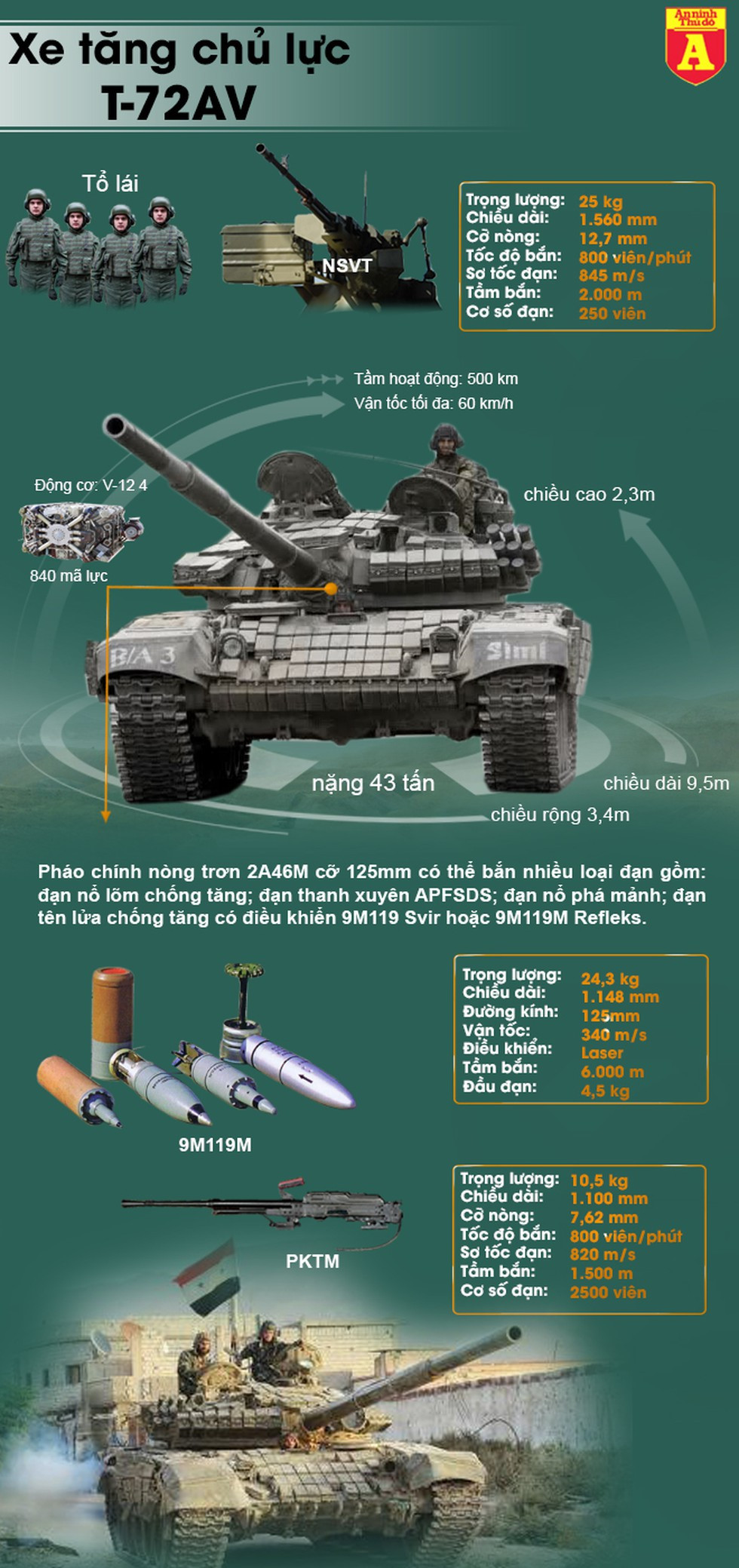 Được biết, T-72AV là biến thể hiện đại nhất và có giáp bảo vệ tốt nhất trong các biến thể T-72 mà quân đội Syria sở hữu. Không rõ số T-72AV chiếm bao nhiêu trong số 1.500 chiếc xe tăng T-72 của quân đội Syria.