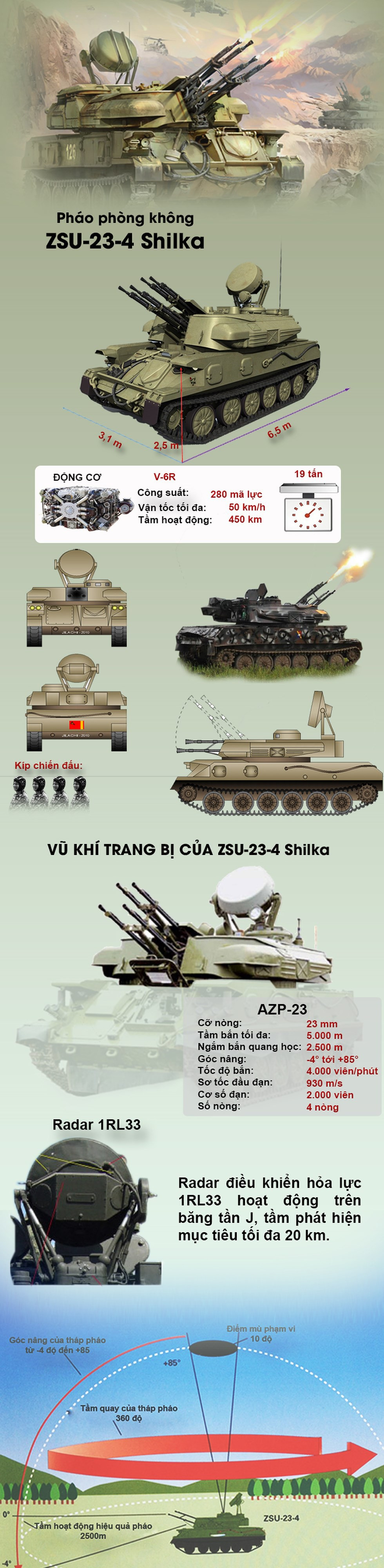 Pháo phòng không tự hành ZSU-23-4 Shilka (Lá chắn nhỏ) được Liên Xô thiết kế trong giai đoạn 1957 - 1962. Các tổ hợp pháo phòng không tự hành ZSU-23-4 lần đầu tiên xuất hiện tại Trung Đông vào mùa xuân năm 1970 trong thành phần các đơn vị của Liên Xô tới Ai Cập. Sau đó vũ khí này được quân đội Syria đặt mua và đưa vào biên chế.