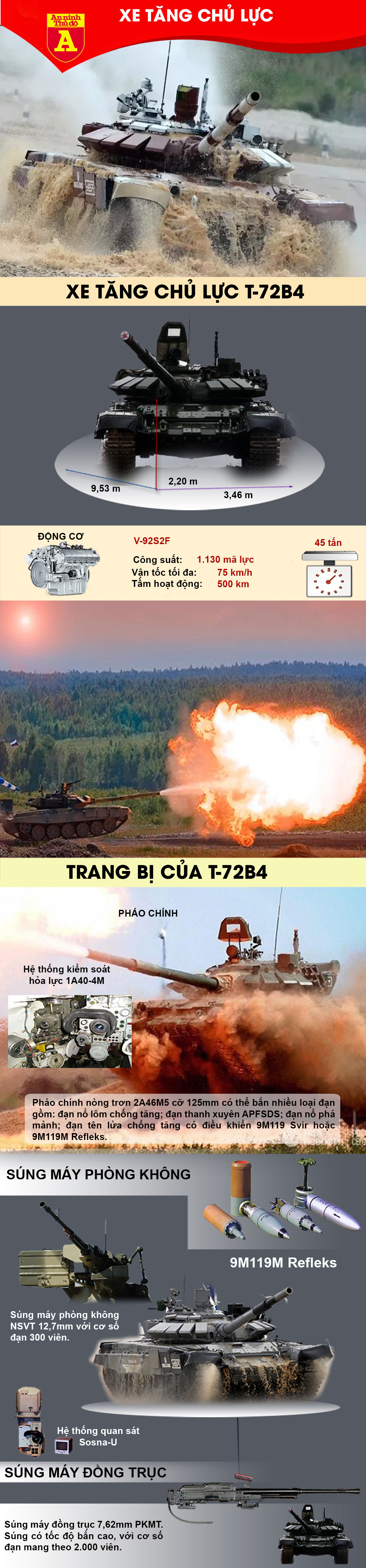 T-72B4 là phiên bản nâng cấp mới từ dòng xe huyền thoại T-72. So với T-72B3 thì phiên bản này được bổ sung kính ngắm toàn cảnh cho trưởng xe bên cạnh kính ngắm quang điện tử truyền thống, điều này giúp xạ thủ dễ dàng bắn chính xác mục tiêu. Ngoài ra xe còn có thêm một lợi thế khác đó là nó sử dụng động cơ diesel tăng áp V-92S2F công suất máy 1.130 mã lực so với loại V-92S2 950 mã lực trên T-72B3. Nhờ động cơ có sức mạnh vượt trội mà chiếc xe tăng của đội tuyển Nga có lợi thế lớn so với các đối thủ ở các bài vượt vật cản, nó băng qua hết sức nhẹ nhàng trong khi đội bạn lại khá khó khăn.