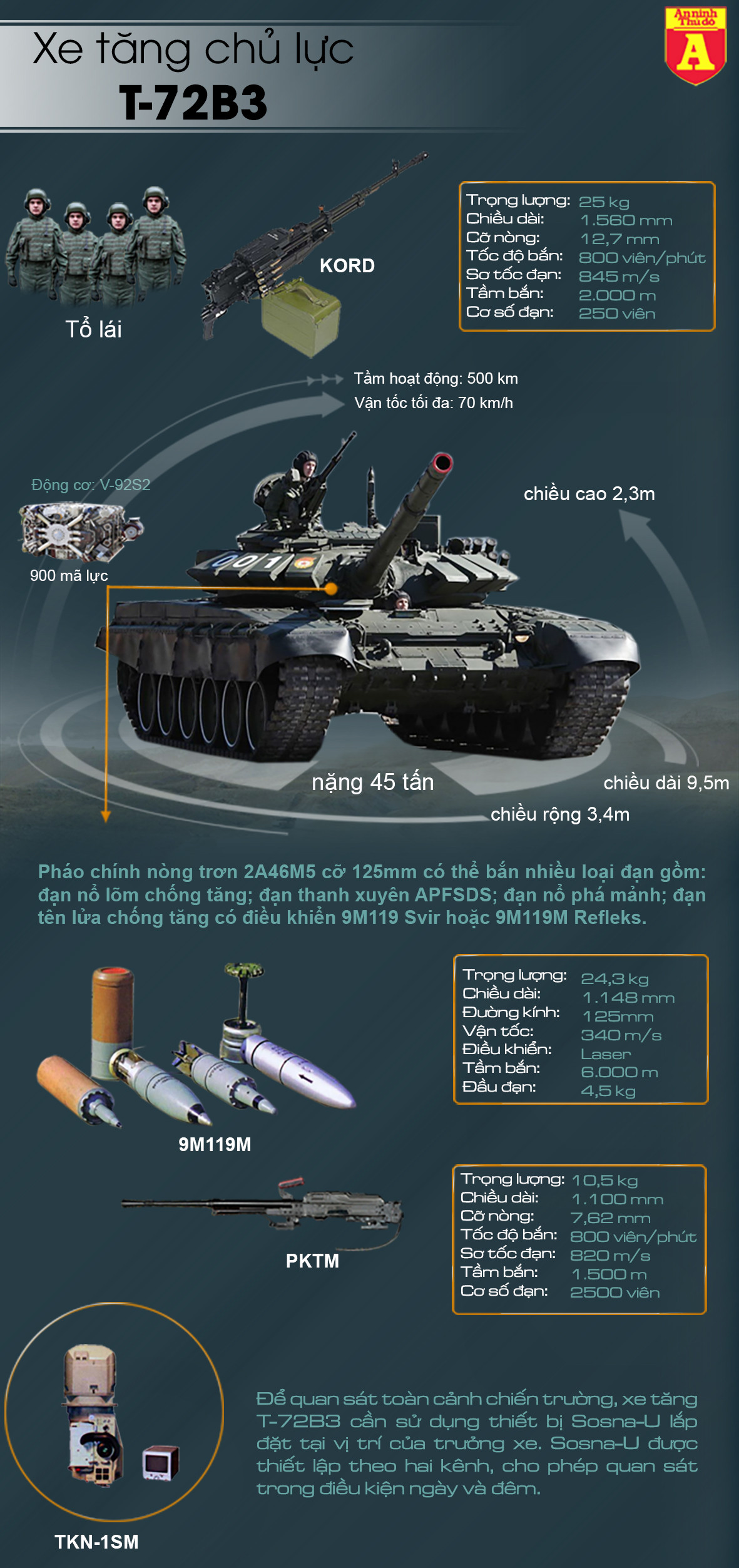 T-72B3 là mẫu nâng cấp mức độ sâu loại xe tăng chiến đấu chủ lực huyền thoại T-72 với việc hiện đại hóa hệ thống động cơ (sử dụng động cơ diesel mới 1.130 mã lực, hệ thống kiểm soát kĩ thuật số), hệ thống trinh sát; trang bị giáp ERA Kontakt-5 mới, được bố trí lắp đặt giống như xe tăng T-90A.