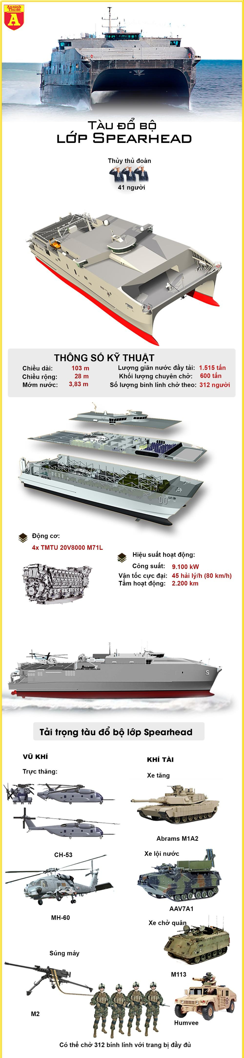 Điểm nổi trội của tàu đổ bộ lớp Spearhead là số lượng thủy thủ chỉ còn 41 người nhờ áp dụng những kỹ thuật điện tử mới trong việc vận hành tàu. Trên tàu còn thiết kế sàn đáp trực thăng, nhờ vậy tàu có thể triển khai được trực thăng săn ngầm MH-60 Seahawk. Với khả năng vận tải 600 tấn hàng hóa hoặc 312 binh sĩ với trang bị đầy đủ, tàu là phương tiện đổ bộ tốc độ cao rất nguy hiểm của hải quân Mỹ.
