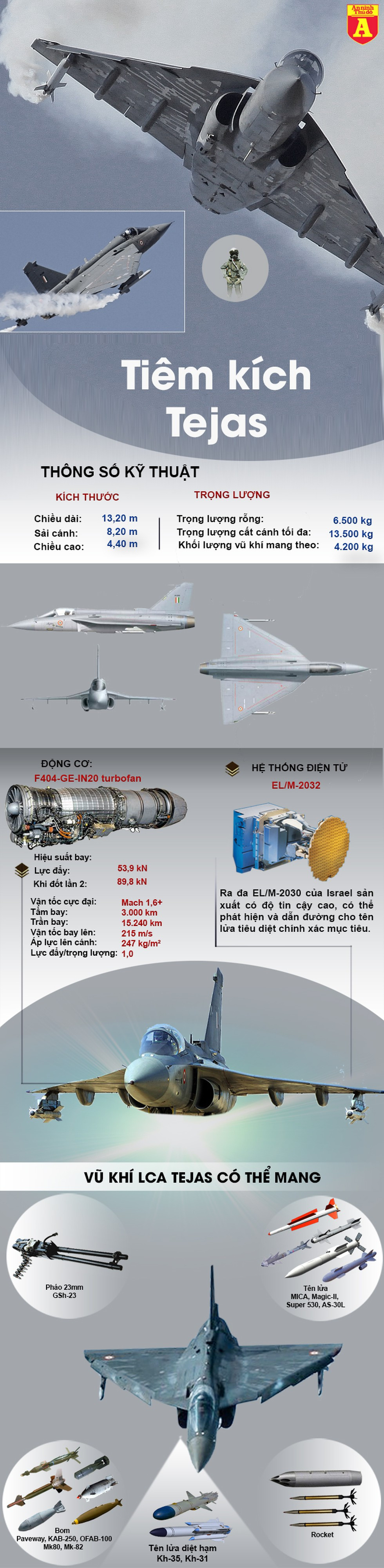 Máy bay chiến đấu HAL Tejas thuộc loại tiêm kích hiện đại hạng nhẹ trên thế giới. Chúng sử dụng những động cơ có hiệu suất cao F404-GE-IN20 và GE F414 của hãng General Electric - Mỹ. Với trọng lượng không tải 6,5 tấn, trọng lượng cất cánh tối đa 13,5 tấn, LCA Tejas thiết kế với 8 giá treo mang được 4,2 tấn vũ khí gồm: tên lửa không đối không; tên lửa không đối đất tầm xa; tên lửa chống tàu; bom dẫn đường.