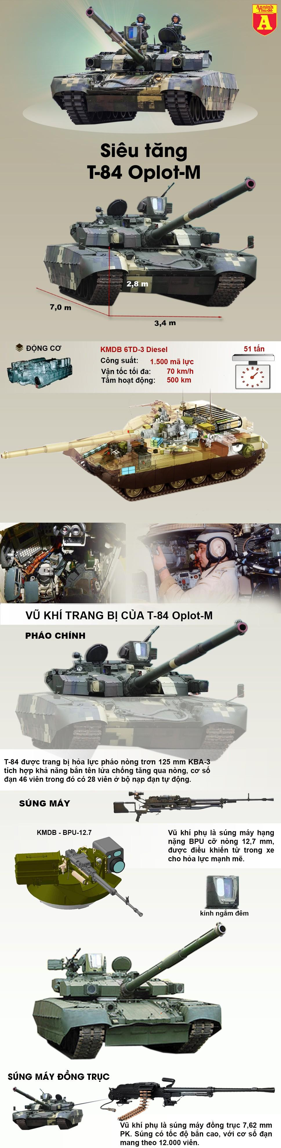 Xe tăng chiến đấu chủ lực (MBT) T-84 Oplot-M là mẫu xe chiến đấu bánh xích có hỏa lực mạnh, độ cơ động cao và khả năng bảo vệ đáng tin cậy, do Viện chế tạo máy Kharkiv Morozov (KMBD) phát triển cho các lực lượng vũ trang Ukraine dựa trên xe tăng chủ lực T-80.T-84 Oplot-M được trang bị giáp phản ứng nổ Duplet thế hệ mới, có thể chống lại đầu đạn tandem.