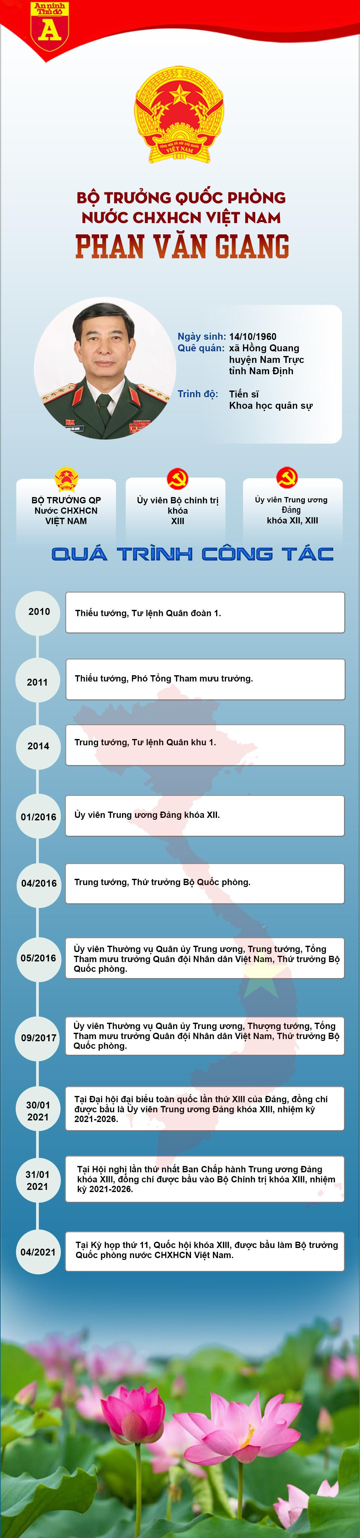 Thượng tướng Phan Văn Giang sinh năm 1960, quê ở huyện Nam Trực, tỉnh Nam Định. Ông là Ủy viên Bộ Chính trị khóa XIII; Ủy viên Trung ương Đảng khóa XII, XIII; Ủy viên Thường vụ Quân ủy Trung ương. Là tiến sĩ Khoa học quân sự, suốt quá trình công tác của ông Giang đều gắn liền với con đường binh nghiệp.