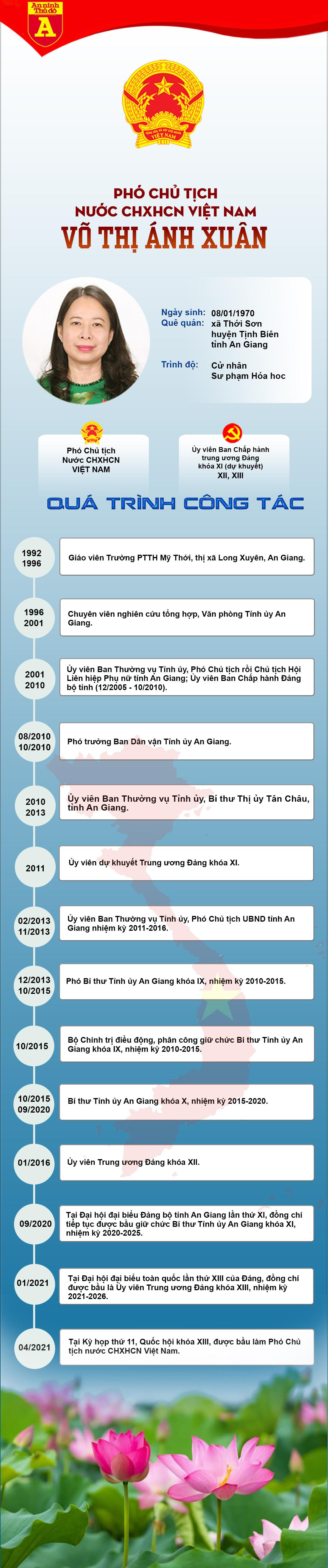 Bà Võ Thị Ánh Xuân 51 tuổi, cử nhân Sư phạm Hóa học, quê ở huyện Tịnh Biên, tỉnh An Giang. Bà là Ủy viên Trung ương Đảng khóa XI (dự khuyết), XII, XIII; Bí thư Tỉnh ủy An Giang; đại biểu Quốc hội khóa XIV. Bà Võ Thị Ánh Xuân là cán bộ trưởng thành ở An Giang, từng có bốn năm là giáo viên trường THPT Mỹ Thới, thị xã Long Xuyên; sau đó làm chuyên viên nghiên cứu tổng hợp, Văn phòng Tỉnh ủy.