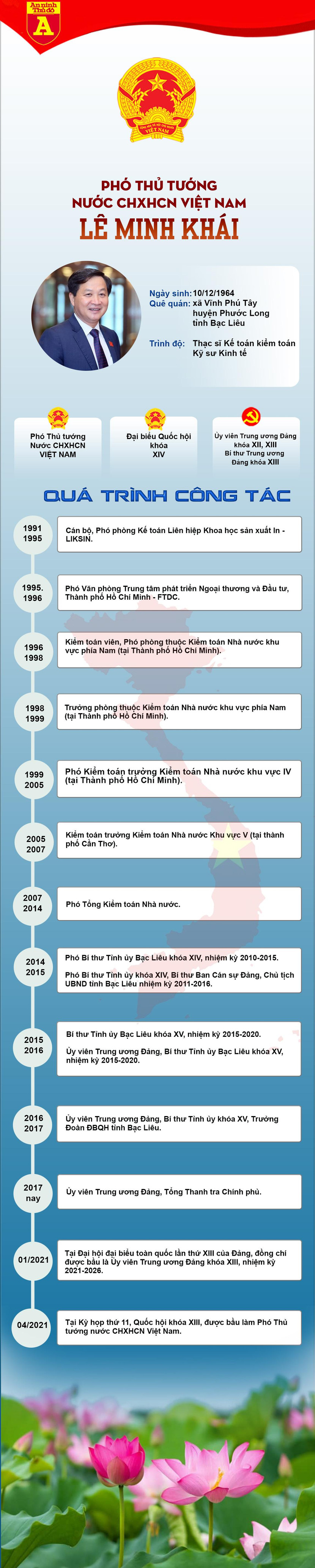 Ông Lê Minh Khái 57 tuổi; thạc sĩ Kế toán kiểm toán, Kỹ sư Kinh tế; quê ở tỉnh Bạc Liêu. Ông là Bí thư Trung ương Đảng khóa XIII; Ủy viên Trung ương Đảng khóa XII, XIII; đại biểu Quốc hội khóa XIV.