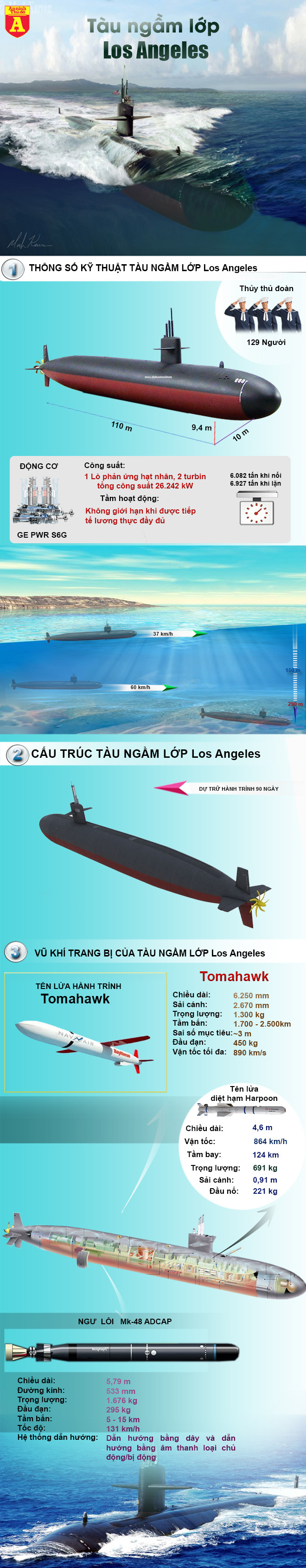 Lớp Los Angeles là dòng tàu ngầm đa nhiệm, thực hiện những sứ mệnh can thiệp vũ trang sau chiến tranh lạnh, vũ khí của chúng có khả năng tấn công ngầm, mặt nước và bờ biển. Cụ thể gồm 12 ống phóng thẳng đứng sử dụng tên lửa hành trình tấn công mặt đất Tomahawk có tầm bắn từ 1.700-2.500km tùy biến thể, bên cạnh đó còn có tên lửa chống hạm UGM-84 Harpoon tầm bắn 130km. Tàu cũng được trang bị những ngư lôi hạng nặng Mark-48 để tiêu diệt kẻ thù.