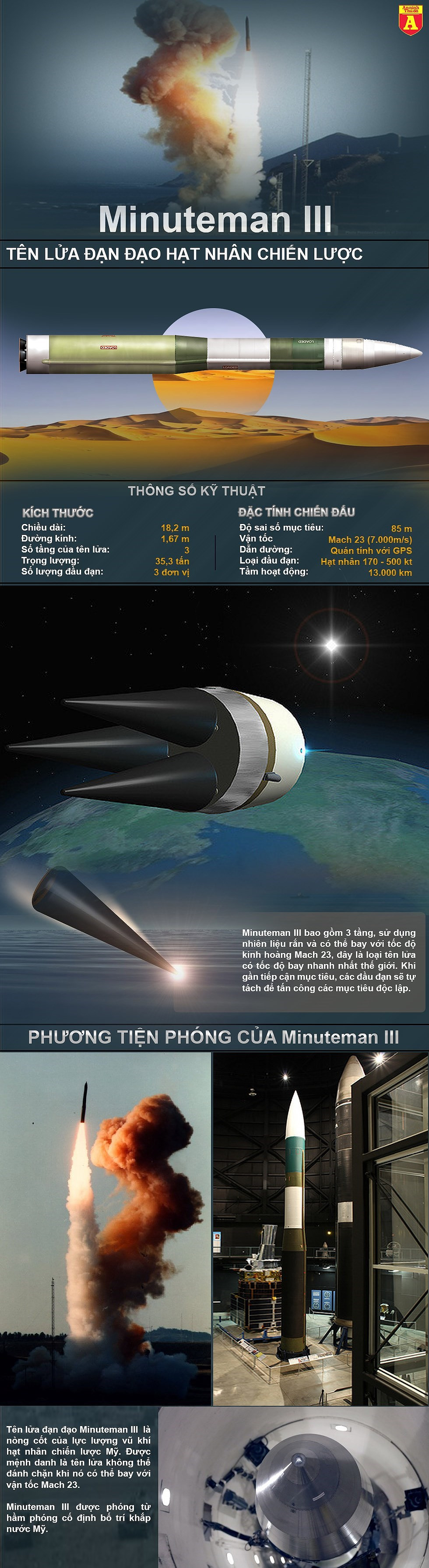 Minuteman III có 3 tầng sử dụng nhiên liệu rắn, trọng lượng 35,3 tấn, chiều dài 18,26m, đường kính thân 1,67m, tầm bắn tối đa lên tới 13.000 km.