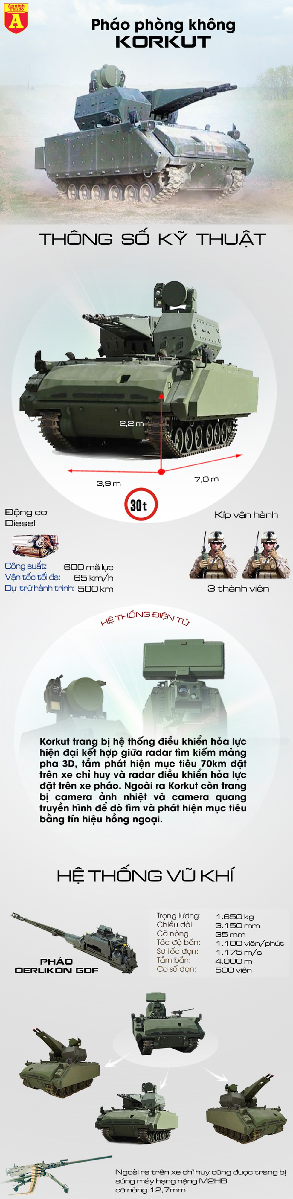 Hỏa lực của xe là hai pháo phòng không cỡ nòng 35mm cho tốc độ bắn 1.100 phát/phút. Tầm bắn đạt 4.000m, ngoài ra trên xe chỉ huy trang bị súng máy hạng nặng M2HB cỡ nòng 12,7mm. Korkut đã có trận thực chiến hồi tháng 10-2016 vừa qua, triệt hạ những quả rocket bắn bởi khủng bố IS. Hiện nay Thổ Nhĩ Kỳ tiếp tục điều hệ thống này sang chiến trường Syria vì lo ngại máy bay hoặc đạn rocket từ đối phương có thể bắn thẳng vào đội hình của quân đội nước này.