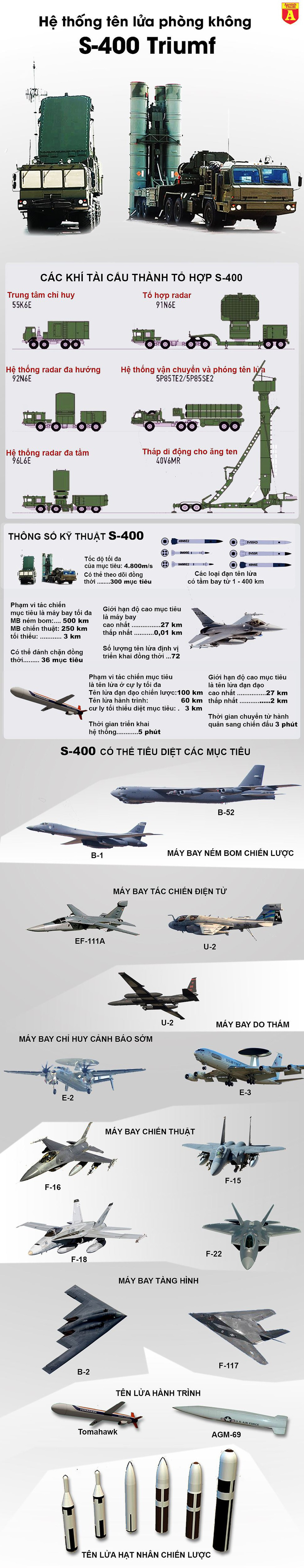 Hệ thống này có thể tiêu diệt tất cả các vật thể xuất hiện trên không, bao gồm máy bay, phương tiện bay không người lái (UAV) hay tên lửa đạn đạo, ở độ cao 50 km và tốc độ tối đa của mục tiêu lên đến 4.800 m/giây. S-400 có khả năng theo dõi 300 mục tiêu và cùng lúc bắn hạ 36 mục tiêu trong đó. Đặc biệt, S-400 đủ sức hạ gục những tên lửa chiến lược có tầm bắn tới 3.500 km, gấp gần 4 lần hệ thống Patriot của Mỹ.