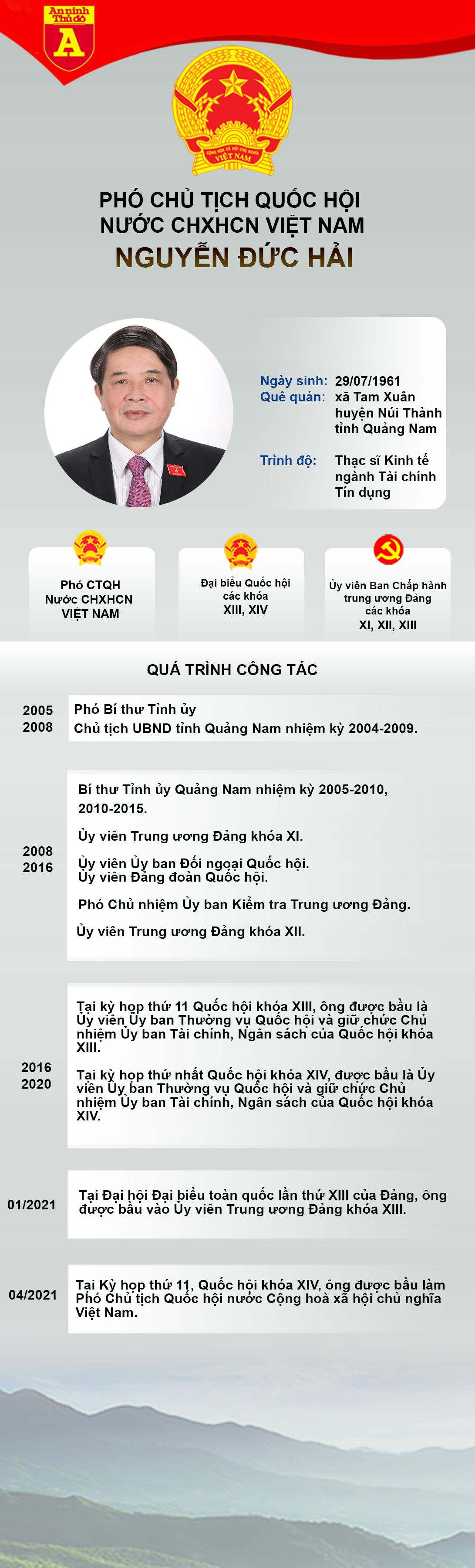 Ông Nguyễn Đức Hải 60 tuổi, Thạc sĩ Kinh tế chuyên ngành Tài chính - Tín dụng, quê ở Quảng Nam; Ủy viên Trung ương Đảng khóa XI, XII, XIII; đại biểu Quốc hội khóa XIII, XIV. Ông từng giữ chức Phó Bí thư Tỉnh ủy, Chủ tịch UBND tỉnh rồi Bí thư Tỉnh ủy Quảng Nam, sau đó được điều động ra Trung ương công tác.