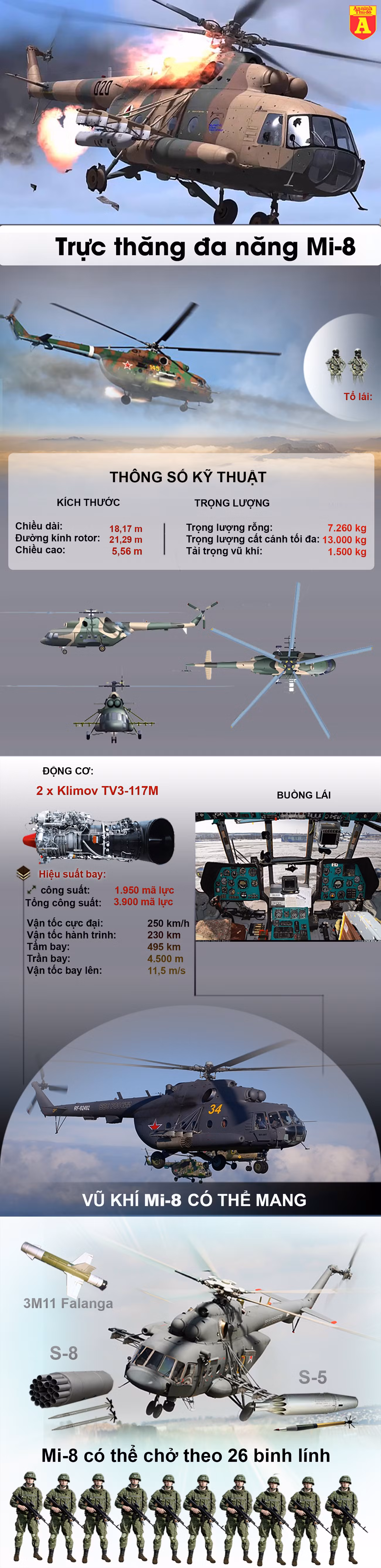 Có rất nhiều biến thể, gồm Mi-8T ngoài khả năng vận chuyển 24 binh sĩ còn được trang bị các tên lửa điều khiển chống tăng. Kiểu Mil Mi-14 dùng cho hải quân, và kiểu Mil Mi-24 tấn công cũng là biến thể từ loại Mi-8.