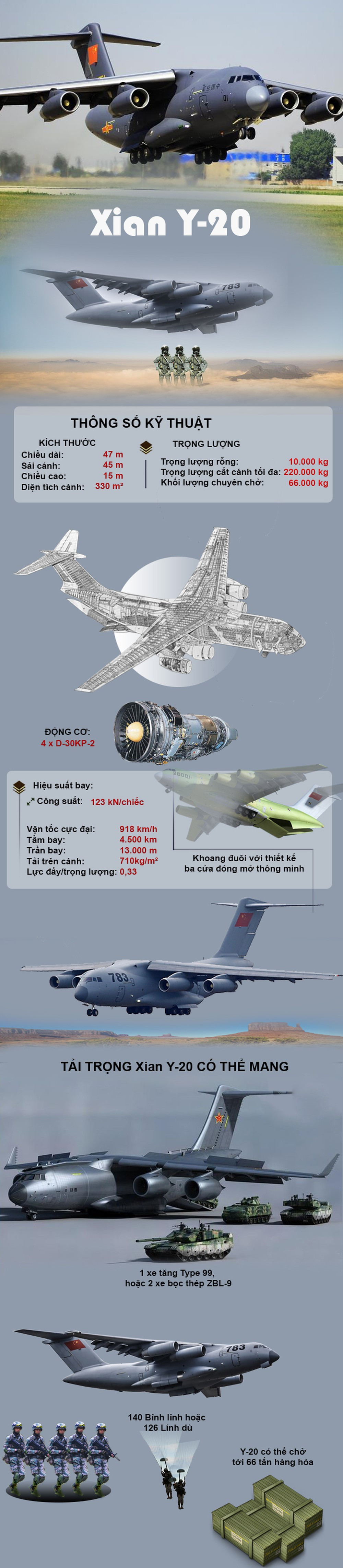 Máy bay vận tải Y-20 được tập đoàn máy bay Tây An phát triển. Chương trình được khởi xướng từ những năm 1990. thực hiện chuyến bay đầu tiên vào năm 2013 và chính thức đi vào hoạt động vào năm 2016. Ước tính cho tới nay đã có khoảng 20 chiếc Y-20 được sản xuất.