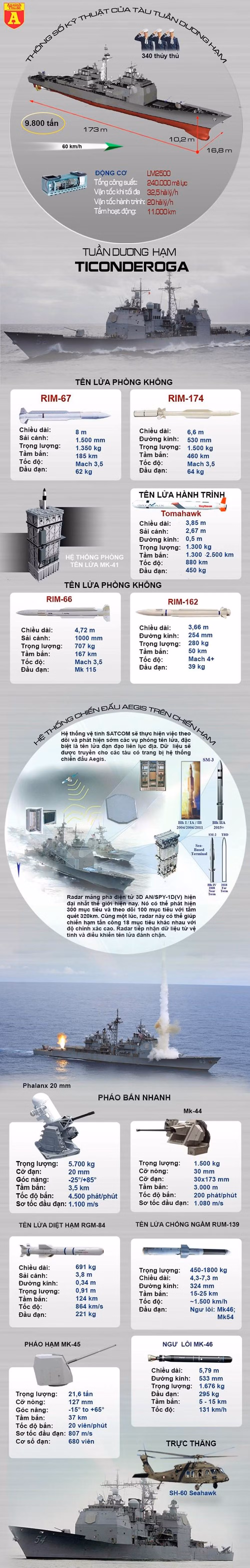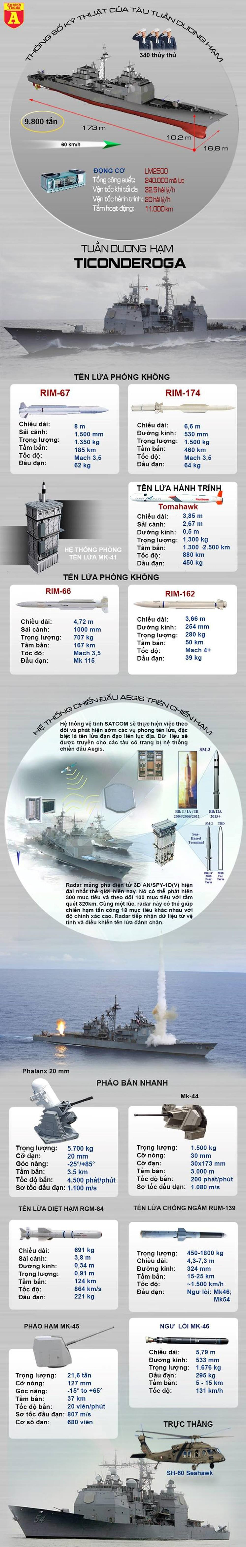 Tuần dương hạm lớp Ticonderoga của Mỹ có chiều dài 173m; rộng 16,8m; lượng giãn nước đầy tải 9.800 tấn. Tàu được trang bị 4 động cơ turbin khí General Electric LM2500 giúp đạt tốc độ tối đa 33,2 hải lý/giờ, tầm hoạt động 3.300 hải lý, vỏ tàu được trang bị lớp giáp Kevlar tại một số vị trí quan trọng.