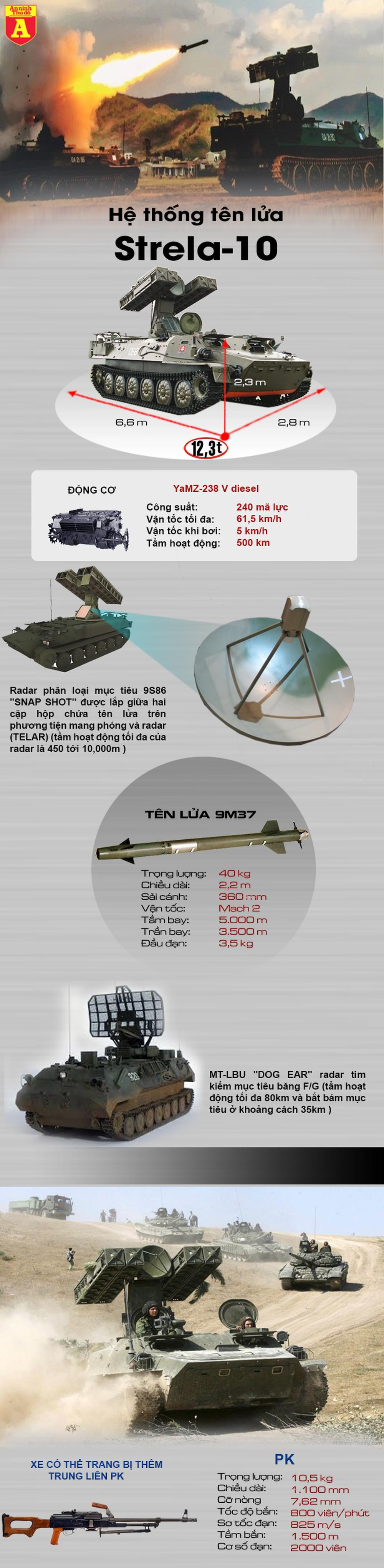 Strela-10 là tổ hợp tên lửa phòng không tầm thấp điều khiển bằng quang/hồng ngoại có khả năng cơ động cao. Tổ hợp gồm khối bệ đỡ giá phóng tên lửa, radar và các thiết bị quang học được đặt trên khung gầm xe lội nước hạng nhẹ MT-LB, có khả năng việt dã và cơ động cao.