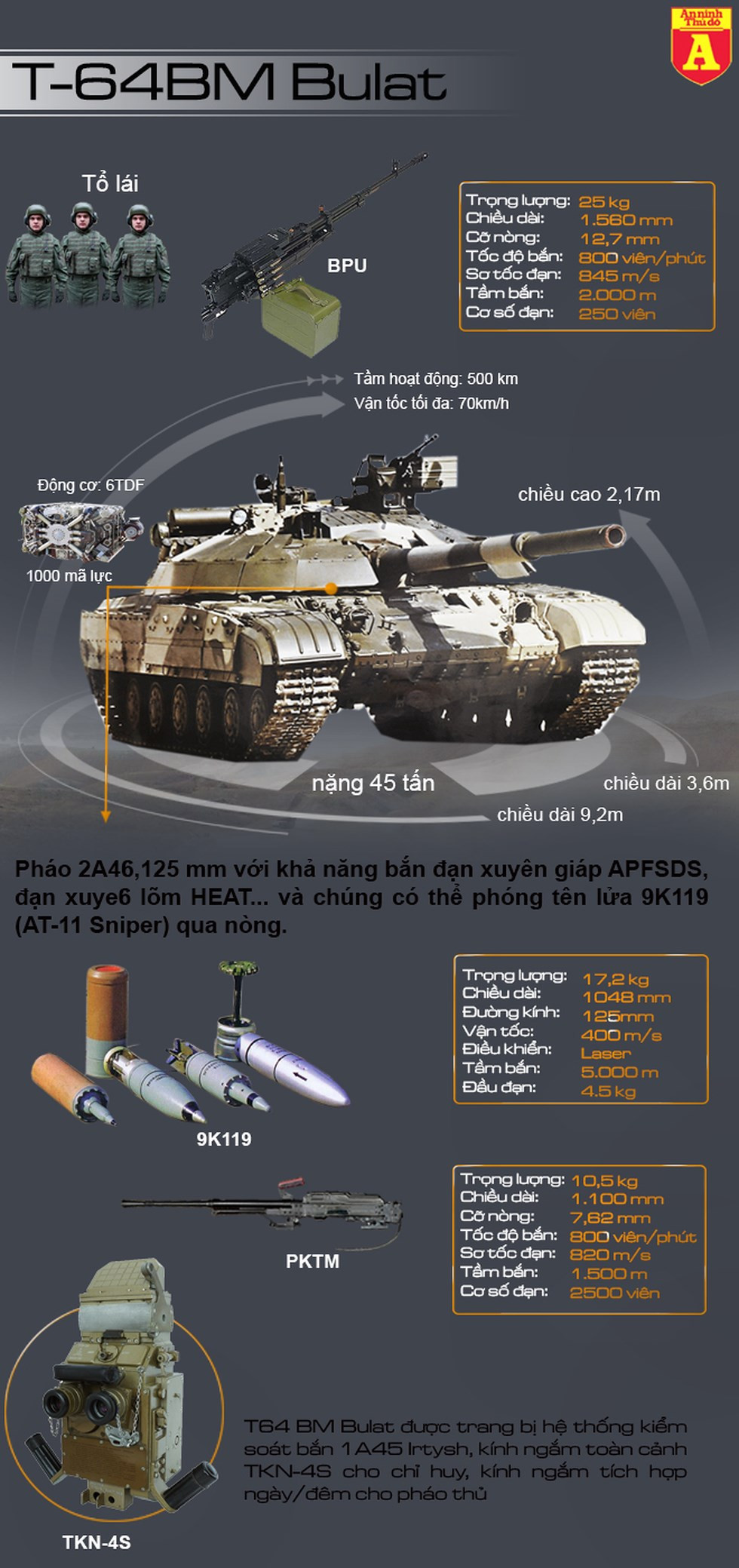T-64BM Bulat là một trong hai loại xe tăng chủ lực mạnh nhất của Ukraine, sức mạnh của chúng chỉ đứng sau T-84. So về ngoại hình những chiếc tăng này không khác biệt mấy so với phiên bản T64BV, tuy nhiên chúng lại được nâng cấp mạnh mẽ về hỏa lực và hệ thống bảo vệ. Cụ thể những chiếc tăng T-64BM Bulat được trang bị giáp phản ứng nổ Kontakt-5, và pháo chính có thể bắn được loại tên lửa 9K119.