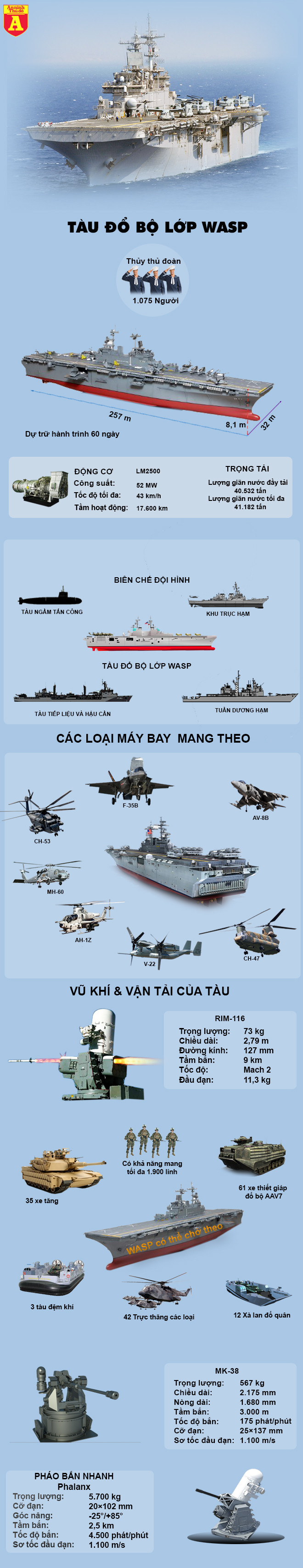 Đặc biệt tàu có thể triển khai các chiến đấu cơ F-35B có khả năng cất, hạ cánh thẳng đứng. Với năng lực tác chiến của máy bay thế hệ thứ 5, tàu đổ bộ lớp Wasp hoàn toàn có thể tung những đòn kinh hoàng vào đối phương.