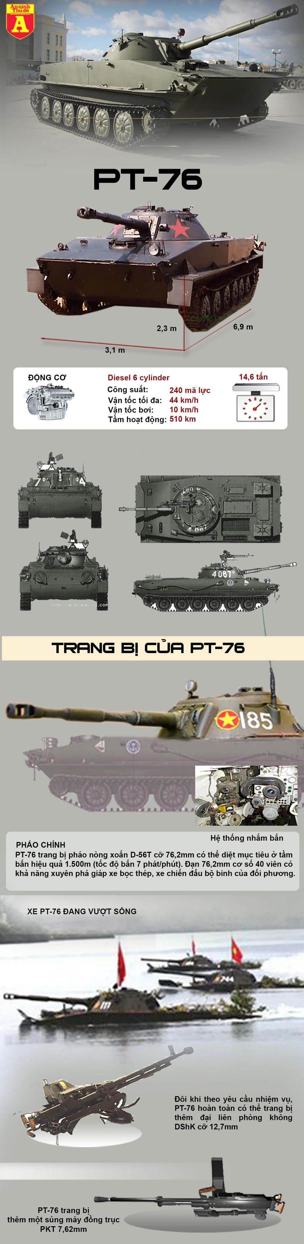 PT-76 - loại xe tăng hạng nhẹ với hỏa lực mạnh của quân đội Xô Viết được thiết kế vào thập niên 1950 được mệnh danh “trâu thép” bởi khả năng cơ động lội nước của chúng. PT-76 được thiết kế chủ yếu để hỗ trợ bộ binh tại những nơi có địa hình lầy lội, nhiều sông ngòi đầm lầy.