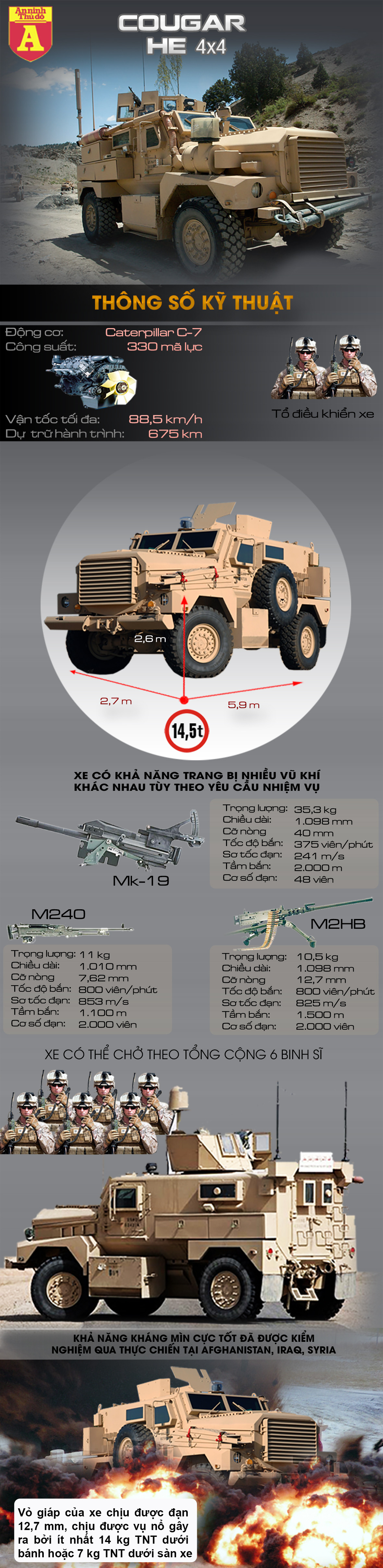 Cougar HE được sản xuất với hai cấu hình 4x4 và 6x6, phổ biến nhất tại chiến trường Syria chính là biến thể Cougar HE 4x4. Thực tế chiến trường cho thấy, xe cơ động tốt trên mọi địa hình, lớp giáp bọc ngoài chống lại hiệu quả các loại đạn bộ binh bắn thẳng và mảnh văng của bom hoặc đạn pháo.