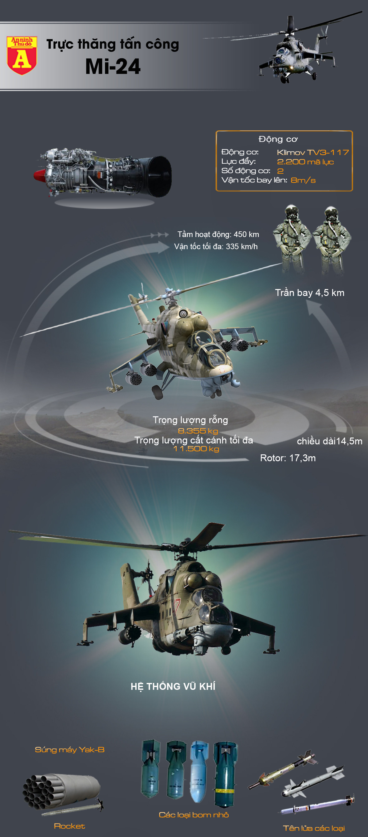 Trực thăng Mi-24, còn được NATO gọi là Hind, được xem như một trong những trực thăng đa năng nhất thế giới. Theo Nga, Mi-24 có thể bay với vận tốc 300 km/h và lên đến độ cao 4.500 m.