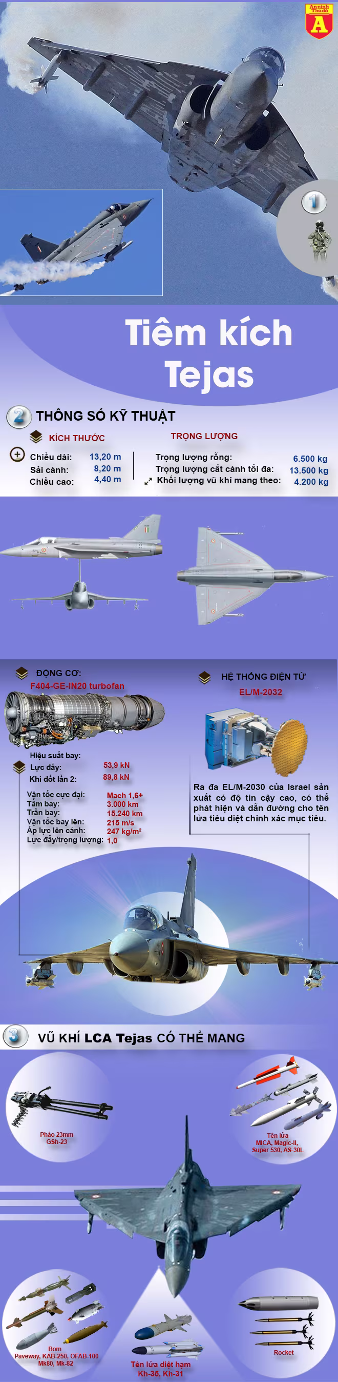 Cùng xem thông số ấn tượng của tiêm kích nội địa Ấn Độ qua infographic dưới đây.