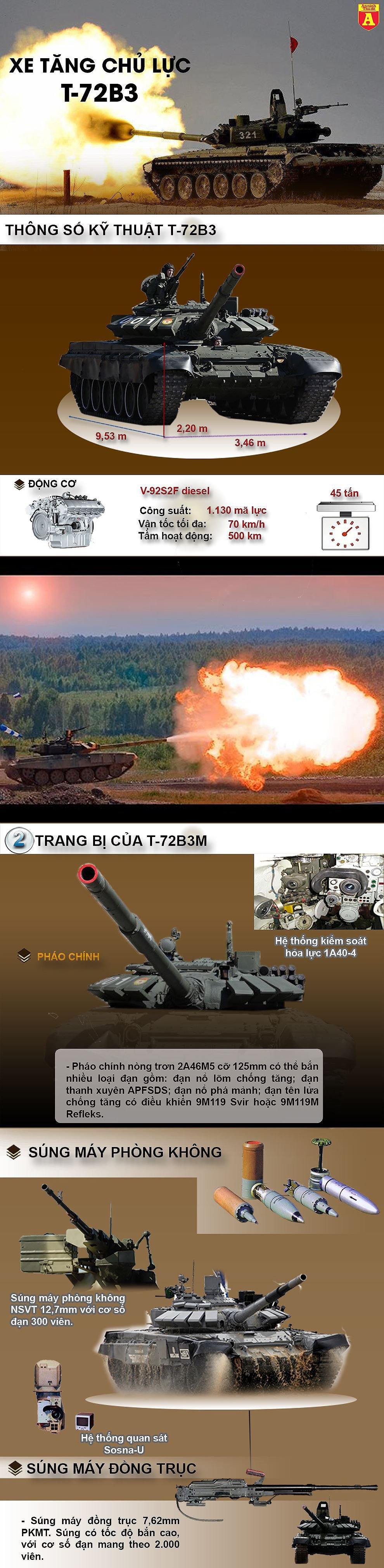 Xe tăng T-72B3 được nâng cấp mạnh mẽ nhất trong dòng T-72 vốn có tuổi đời trên 20 năm. Những thay đổi bao gồm việc được trang bị pháo nòng trơn 2A46M cỡ 125mm có khả năng phóng tên lửa chống tăng 9M119 Svir hoặc 9M119M Refleks. Các tên lửa này sử dụng hệ dẫn đường laser, tầm bắn 4-5km, trang bị đầu nổ kiểu tandem nặng 4,5kg.