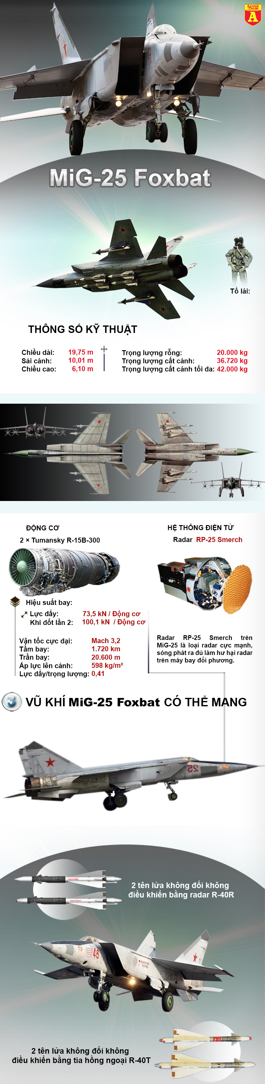 MiG-25 được thiết kế là một máy bay tiêm kích đánh chặn, trinh sát và ném bom siêu thanh được thiết kế bởi phòng thiết kế nổi tiếng Mikoyan-Gurevich của Liên Xô vào năm 1964 và được biên chế vào năm 1970. MiG-25 có một thiết kế đơn giản nhưng hiệu quả với hệ thống điện tử dùng đèn chân không, 2 động cơ lớn và sử dụng vật liệu titan trong thiết kế khung thân nhằm tăng độ bền cơ học. Sự xuất hiện của MiG-25 vào thời điểm đó đã khiến giới quân sự phương Tây kinh hoàng bởi tốc độ cực kỳ khủng khiếp của nó họ đã đặt biệt danh cho tiêm kích này là "ma tốc độ".