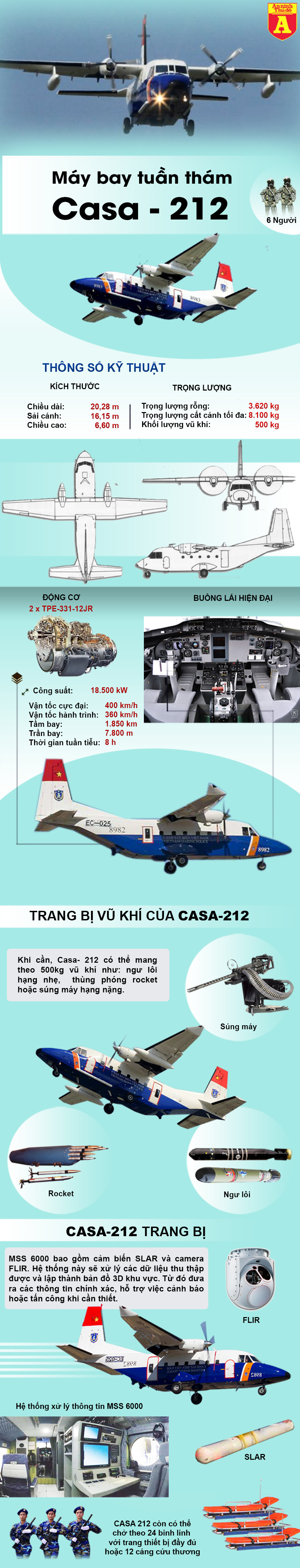 Máy bay Casa-212 là máy bay vận tải quân sự đa nhiệm thế hệ thứ 4 với nhiều trang bị kỹ thuật hiện đại theo chuẩn châu Âu do Tây Ban Nha nghiên cứu, chế tạo. Chúng có khả năng hoạt động liên tiếp 8 giờ với trần bay 7.800m. Phi hành đoàn bao gồm 2 phi công, 4 nhân viên kỹ thuật, 24 binh sĩ hoặc 12 người bị thương.