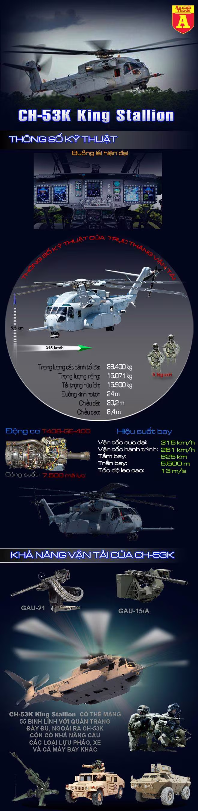 Là loại trực thăng vận tải lớn nhất của Quân đội Mỹ hiện nay, trực thăng vận tải hạng nặng CH-53K King Stallion là biến thể mới nhất của dòng trực thăng CH-53 Sea Stallion được Sikorsky phát triển cho hải quân đánh bộ Mỹ từ những năm 1960.