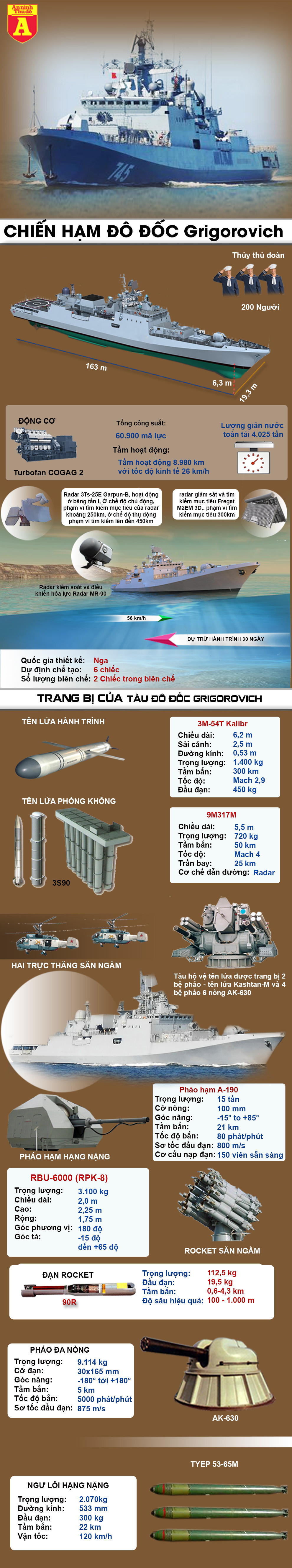 Đô đốc Grigorovich hiện được coi là một trong những tàu chiến có sức mạnh công thủ toàn diện. Cùng xem thông số tàu chiến này qua infographic dưới đây.