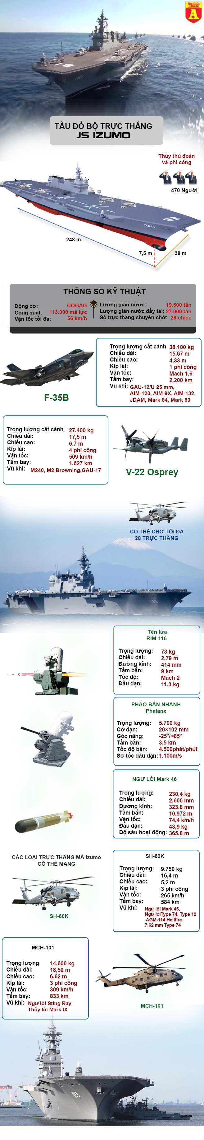 Chính phủ Nhật Bản đang nghiêm túc nghiên cứu đề án cải tạo tàu sân bay trực thăng lớp Izumo để mang được tiêm kích tàng hình F-35B, phiên bản cất hạ cánh thẳng đứng của Thủy quân lục chiến Mỹ.