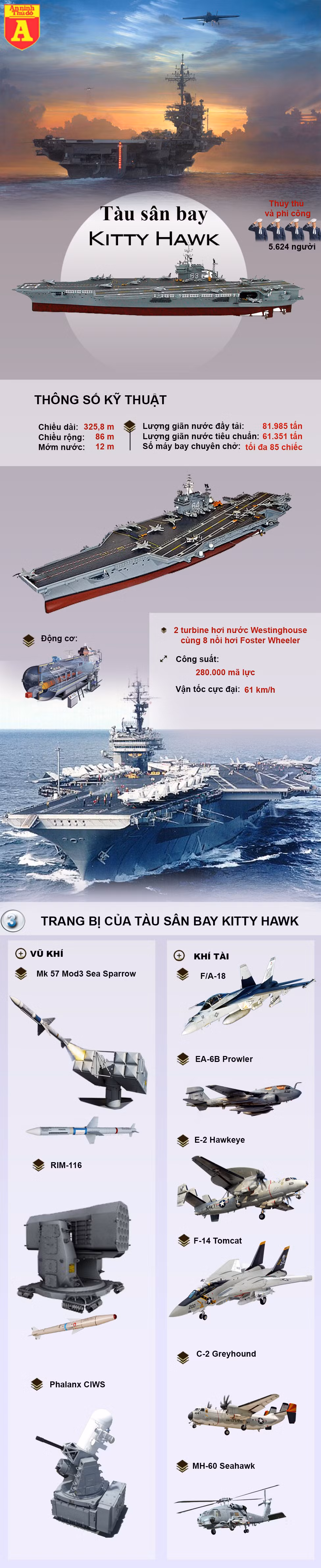 Nhiều chuyên gia cho rằng, tuy có tuổi đời lớn hơn tàu sân bay INS Vikramaditya, nhưng USS Kitty Hawk lại có nhiều ưu điểm vượt trội như trọng tải lớn hơn 82.200 tấn so với 45.000 tấn, hệ thống đường băng với máy phóng hơi nước hiện đại và cho phép máy bay tiêm kích hạm có thể mang tải trọng vũ khí lớn hơn, cuối cùng, nếu Ấn Độ trang bị tiêm kích hạm hạng nặng FA-18E/F Super Hornet sẽ có sức mạnh hơn hẳn tiêm kích hạm hạng trung MiG-29K vốn vẫn tồn tại nhiều khuyết điểm.
