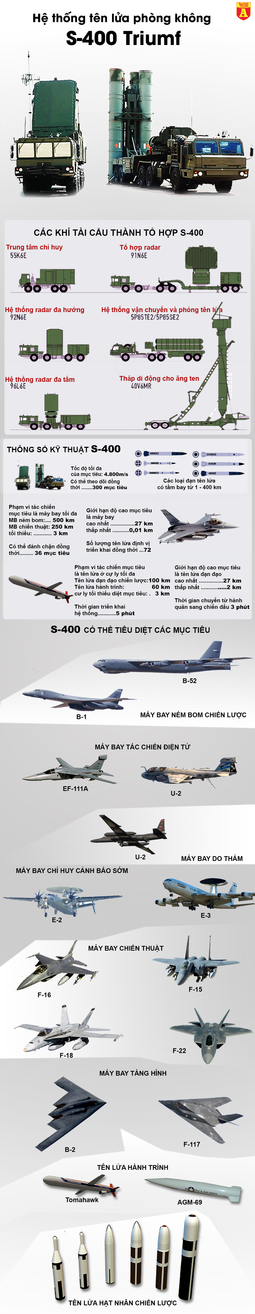 S-400 Triumph là hệ thống tên lửa đất đối không di động thế hệ tiếp theo của Nga. Hệ thống tên lửa này mang 3 loại tên lửa khác nhau có khả năng phá hủy các mục tiêu trên không từ tầm ngắn đến tầm xa.