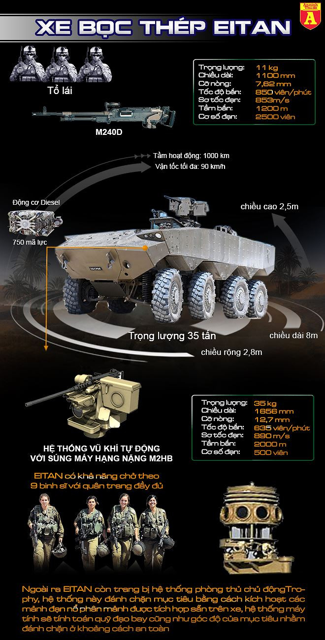 Bộ Quốc phòng Israel cho biết, đã bắt đầu đặt mua và trang bị xe bọc thép chở quân (APC) bánh lốp 8x8 Eitan do nước này tự thiết kế. Được biết xe bọc thép Eitan là sự kết hợp công nghệ của xe tăng Merkava và xe thiết giáp chở quân Namer.