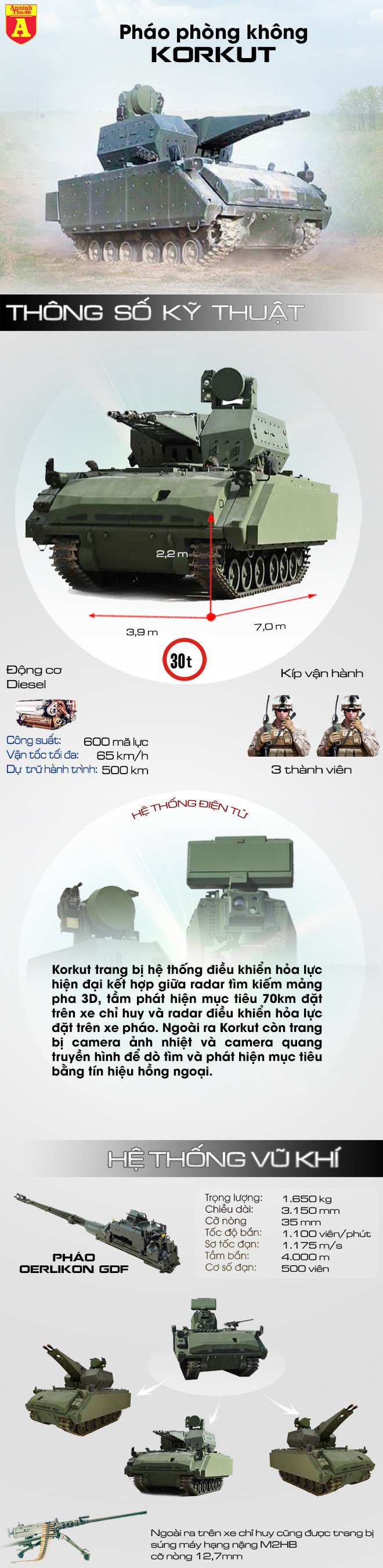 Hỏa lực của xe là hai pháo phòng không cỡ nòng 35mm cho tốc độ bắn 1.100 phát/phút. Tầm bắn đạt 4.000m, ngoài ra trên xe chỉ huy trang bị súng máy hạng nặng M2HB cỡ nòng 12,7mm. Korkut đã có trận thực chiến ngay trong tháng 10-2016 vừa qua, triệt hạ những quả rocket bắn bởi khủng bố IS.