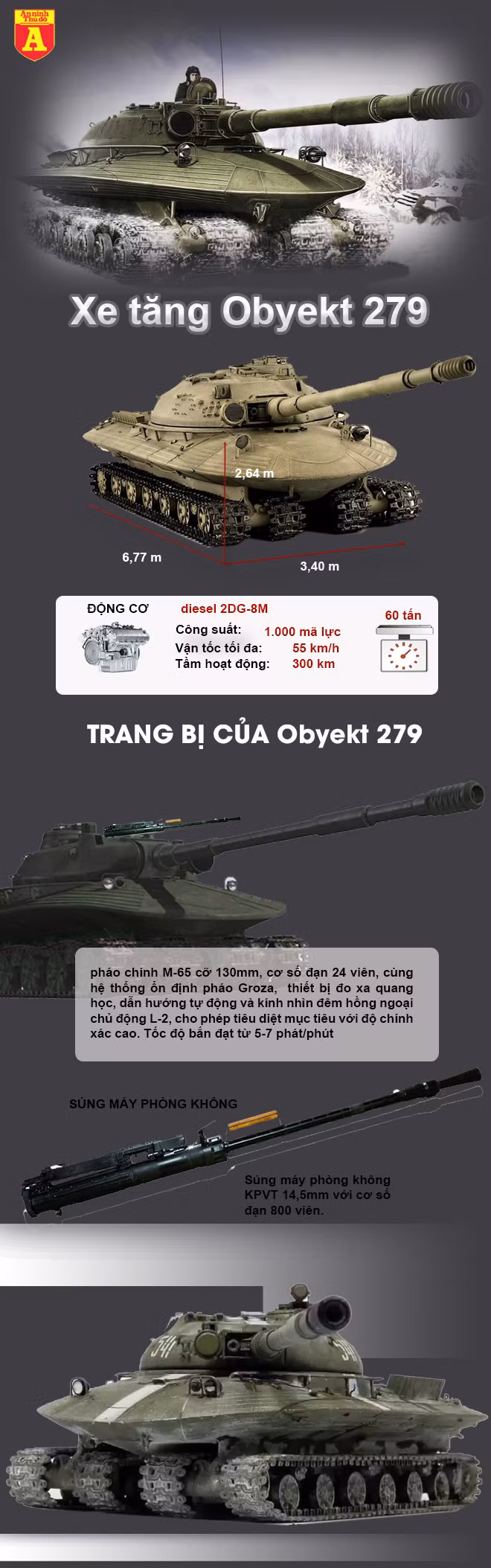Toàn bộ phần thân của Obyekt 279 được bọc giáp, hai bên hông dày 182mm và phần tháp pháo dày tới 319mm. Động cơ Diesel 2DG-8m với công suất 1.000 mã lực, đây là động cơ xe tăng mạnh nhất thời đó của Liên Xô, giúp "con quái vật" nặng 60 tấn này di chuyển với vận tốc tối đa lên tới 55km/h.