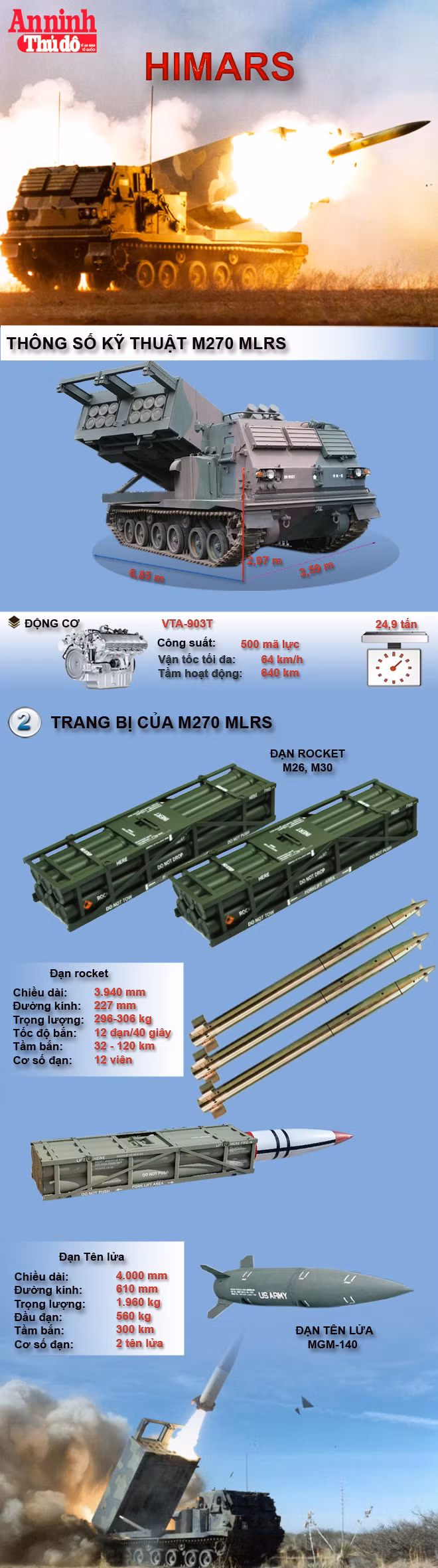Với thiết kế dạng module, pháo vừa có thể bắn đạn rocket vừa có thể bắn tên lửa chiến thuật. Đạn rocket M26 của M270 có đường kính 227 mm, trọng lượng 307 kg, với đầu đạn nặng 120 kg, tầm bắn tối đa 32 km, tạo ra vùng sát thương có diện tích 78,5 hecta.