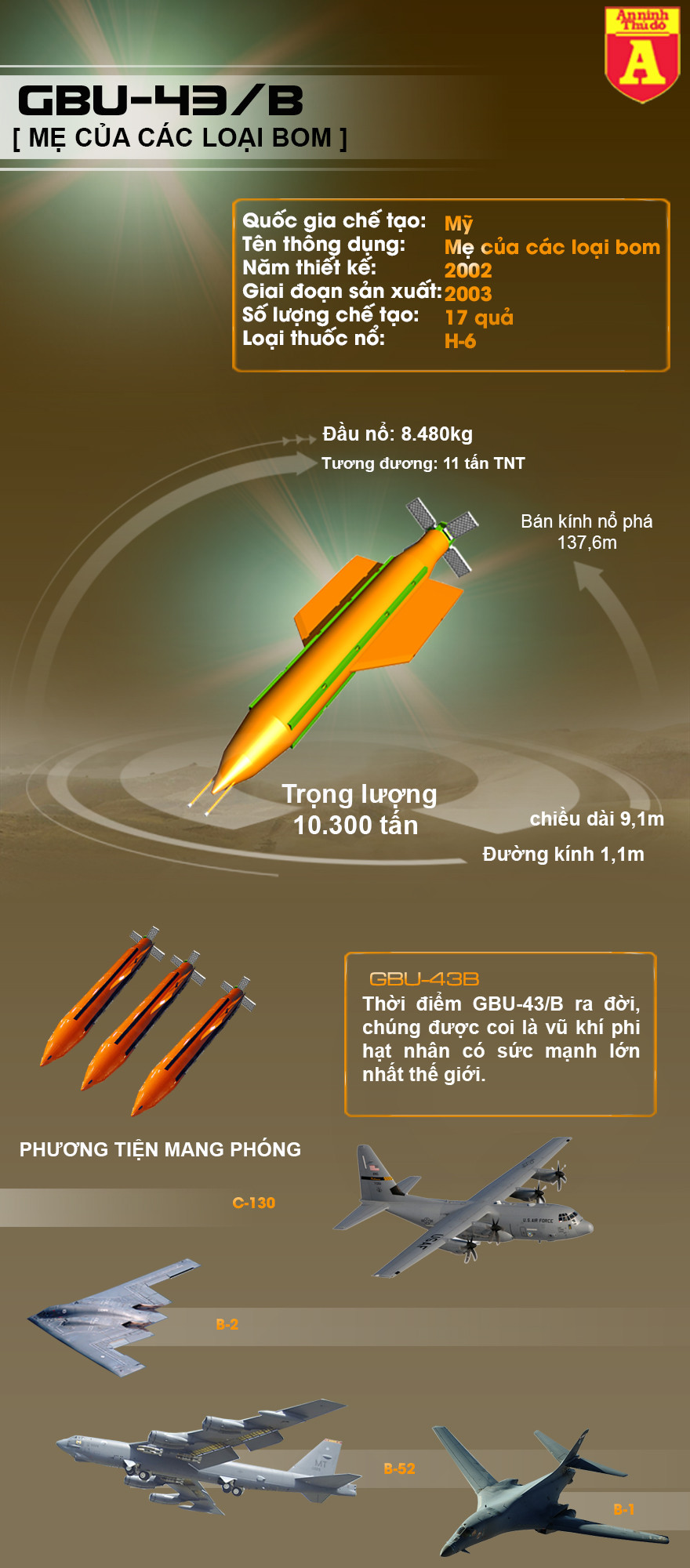 GBU-43 (MOAB) hay còn được biết với tên thông dụng "Mẹ của các loại bom" là loại bom quy ước có kích cỡ rất lớn, được thiết kế và trang bị cho Quân đội Mỹ bởi Albert L. Weimorts Jr. Đây là loại vũ khí hàng không đầu tiên của Mỹ sử dụng cánh đuôi kiểu mắt lưới tương tự như trên tên lửa không đối không R-77 của Nga.