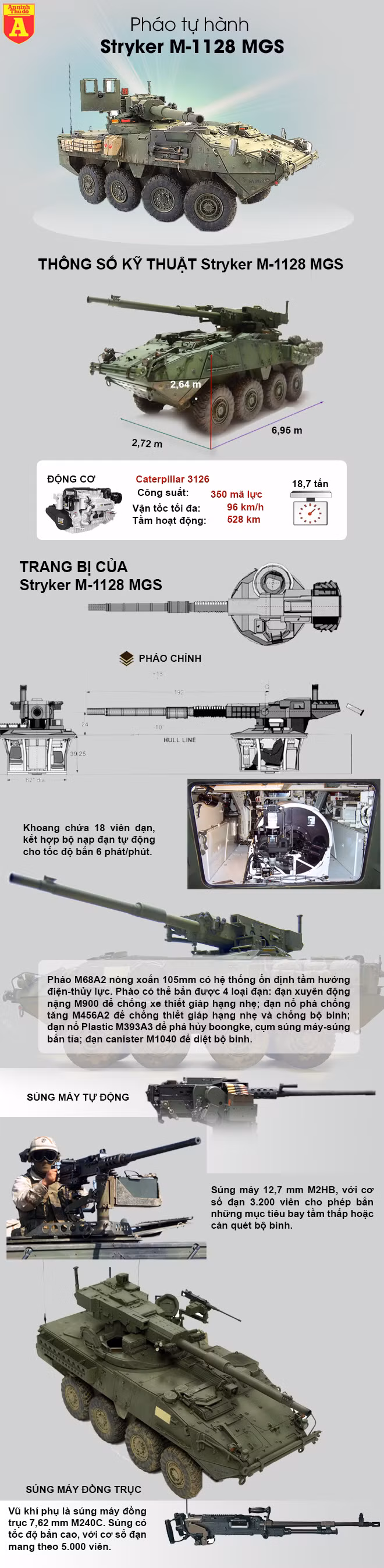 Stryker M1128 MGS được trang bị hệ thống vũ khí mạnh mẽ bao gồm 1 khẩu pháo 105 mm M68A2 với hệ thống nạp đạn tự động, 1 súng máy đồng trục M240C cỡ 7,62 mm, 1 súng máy hạng nặng M2 cỡ 12,7 mm và 2 cụm ống phóng đạn khói M6. Nhiệm vụ chính của Stryker M1128 MGS là chi viện hoả lực trực tiếp cho bộ binh chống lại địch núp trong công sự, các toà nhà cũng như có thể thể tiêu diệt các loại xe tăng và xe bọc thép hạng nhẹ của đối phương. Chiến trường Syria đang rất khốc liệt, rất có thể Mỹ sẽ triển khai dòng xe này bên cạnh xe chiến đấu bộ binh Stryker Dragoon để tăng cường sức mạnh cho những đơn vị lính đặc nhiệm tại đây, nhằm trợ giúp các đồng minh của mình.