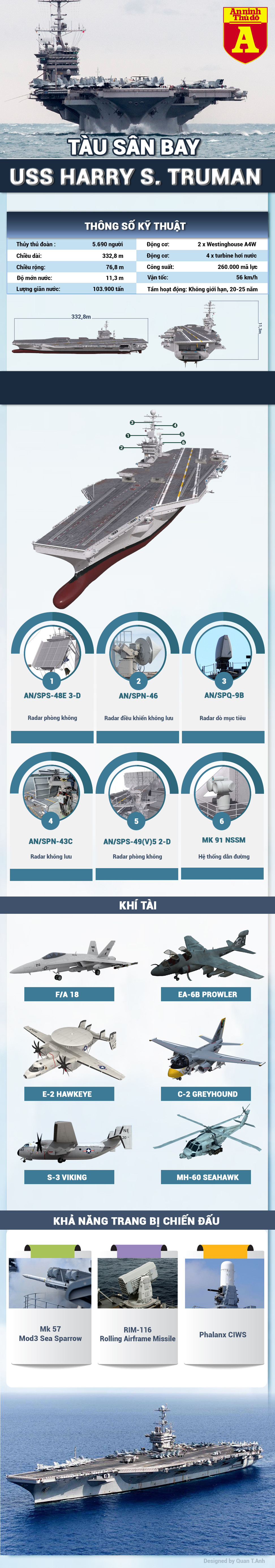 Chiếc USS Harry S. Truman được ví như khách sạn nổi, một thành phố thu nhỏ của nước Mỹ. Tàu có đầy đủ các dịch vụ thiết yếu, phòng phẫu thuật, đầu bếp chuyên nghiệp. USS Harry S. Truman là căn cứ xuất kích của các máy bay chiến đấu siêu hiện đại F/A-18, EA-68 Prowler, S-3 Viking, E-2C Hawkeye và SH-60 Seahawk.