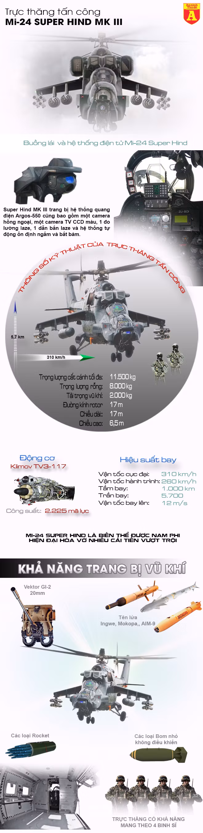 Những tên lửa chống tăng hiện đại hàng đầu của Nam Phi cũng được trang bị trên biến thể nâng cấp này. Mi-24 Super Hind Mk III chính là cơn ác mộng đối với lực lượng tăng thiết giáp và bộ binh đối phương trong chiến trường hiện đại.