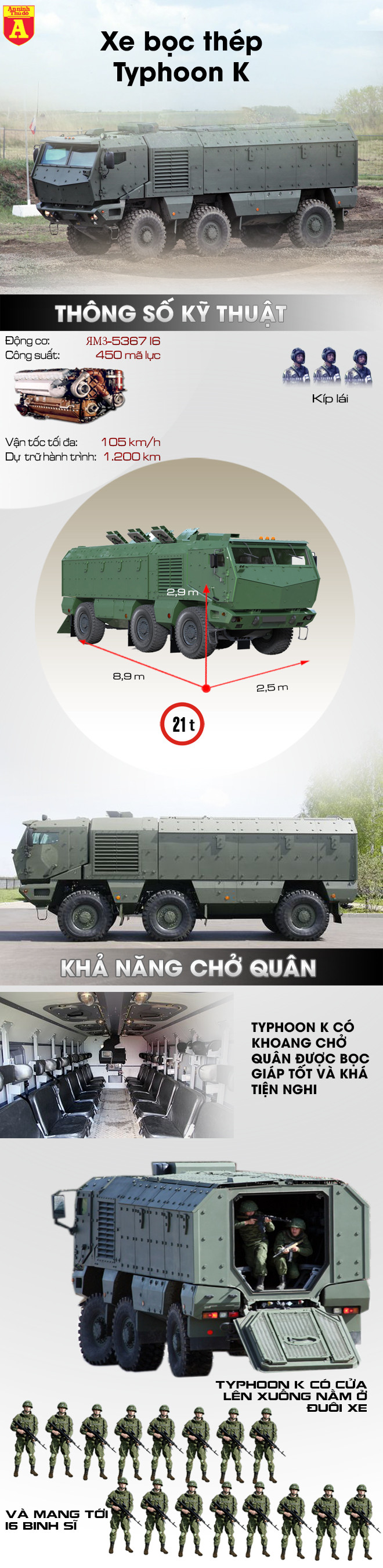 Typhoon K là phiên bản mới nhất trong gia đình xe bọc thép Typhoon của Nga. Xe có thiết kế khí động học khá độc đáo với khung gầm hình chữ V để phân tán lực nổ, các mặt cắt phía trước giúp xe có khả năng làm chệch hướng của các loại đạn bộ binh bắn thẳng. Trên nóc xe bố trí rất nhiều cửa để từ đó người lính tác chiến ngay cả khi đang xe đang hành tiến. Typhoon K cũng được thiết kế kiểu cửa lên xuống ở đuôi xe và có khả năng chở tới 16 binh sĩ. Dù xe có trọng lượng lên tới 21 tấn, song được trang bị động cơ diesel công suất 450 mã lực giúp chiếc xe có thể hành tiến với vận tốc tối đa 105km/h và dự trữ hành trình lên tới 1.200km.