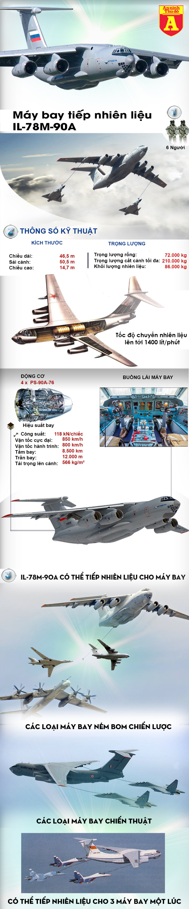 Không quân Nga đang duy trì hoạt động của máy bay tiếp nhiên liệu Ilyushin Il-78M. Tầm bay xa, khả năng mang lượng nhiên liệu lớn, có khả năng tiếp cho 3 máy bay chiến đấu cùng lúc. Đây được đánh giá là những máy bay tiếp nhiên liệu mạnh nhất thế giới. Chưa dừng lại ở đó, mới đây, nước này tiếp tục sản xuất thành công phiên bản máy bay tiếp nhiên liệu mới nhất mang tên Il-78M-90A với nhiều cải tiến vượt trội.