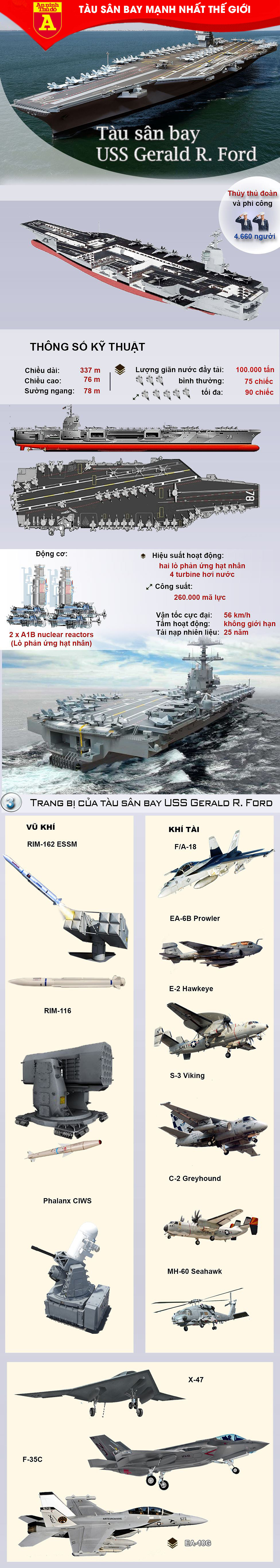 Siêu hàng không mẫu hạm lớp Ford được coi là tàu sân bay mạnh nhất thế giới hiện nay. Gerald R. Ford (CVN-78) là chiếc đầu tiên thuộc lớp này được khởi đóng vào năm 2009 và mới được bàn giao trong năm ngoái. Hải quân Mỹ dự định sẽ cùng lúc mua thêm 2 chiếc nữa trong năm tài khóa 2019 để tiết kiệm chi phí.