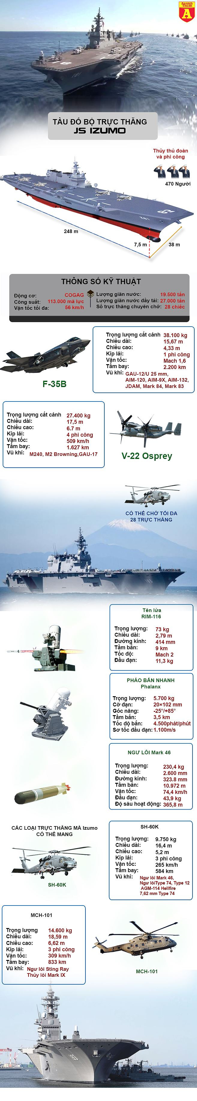 Bộ Quốc phòng Nhật Bản cho biết, sau khi được cải tiến, tàu khu trục trực thăng Izumo có thể trở thành tàu sân bay vận hành máy bay chiến đấu tàng hình F-35B. Một số chuyên gia nhấn mạnh rằng nó có thể trở thành bãi đáp cho các loại máy bay có khả năng cất cánh thẳng đứng như F-35B hoặc V-22 Osprey, bởi kích cỡ của nó lớn hơn cả tàu lớp Hyuga mà Hải quân Nhật Bản đang sử dụng. Đây là tàu chiến lớn nhất Nhật Bản hiện nay và lớn thứ ba ở Châu Á, sau tàu sân bay Liêu Ninh của Trung quốc và tàu sân bay INS Vikramaditya của Ấn Độ.