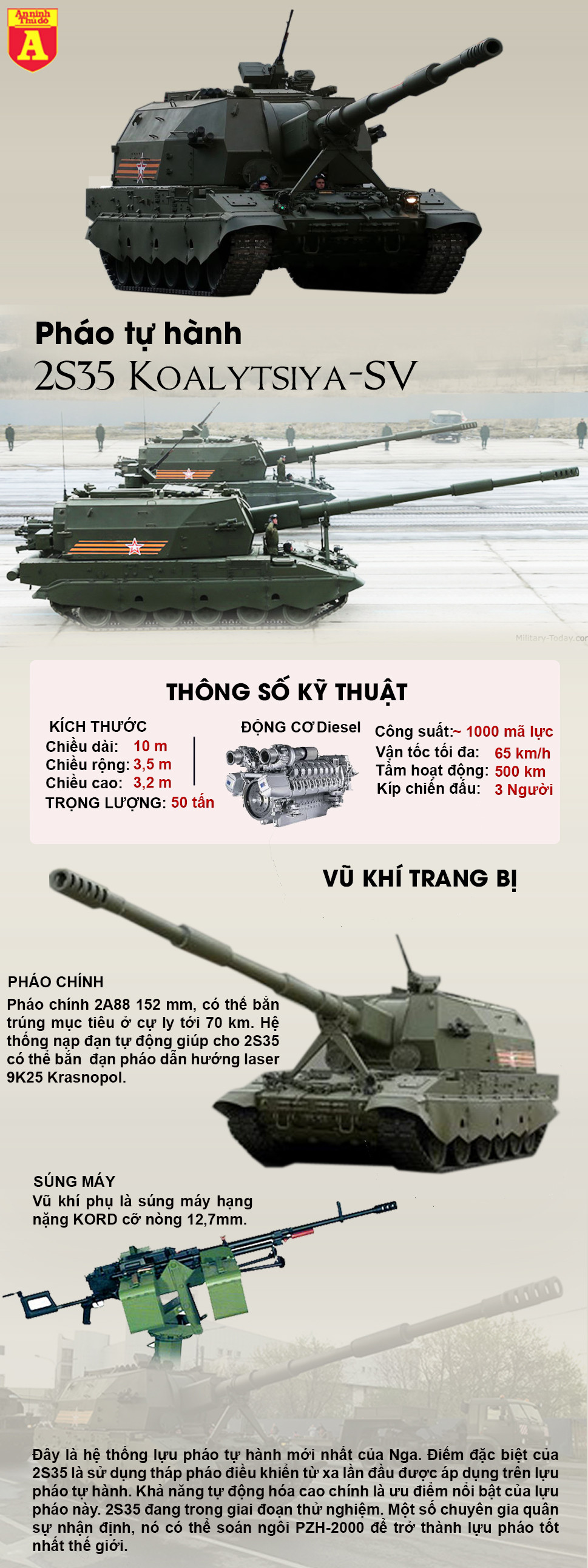 Pháo tự hành 2S35 Koalitsiya-SV xuất hiện lần đầu năm 2015, dự kiến biên chế trong quân đội Nga vào năm 2020. So với các sản phẩm cùng loại, 2S35 Koalitsiya-SV vượt trội với tầm bắn lên tới 70km, đặc biệt siêu chính xác. Với tốc độ bắn lên tới 16 phát/phút, 2S35 Koalitsiya-SV hứa hẹn sẽ là nỗi ác mộng cho đối phương.