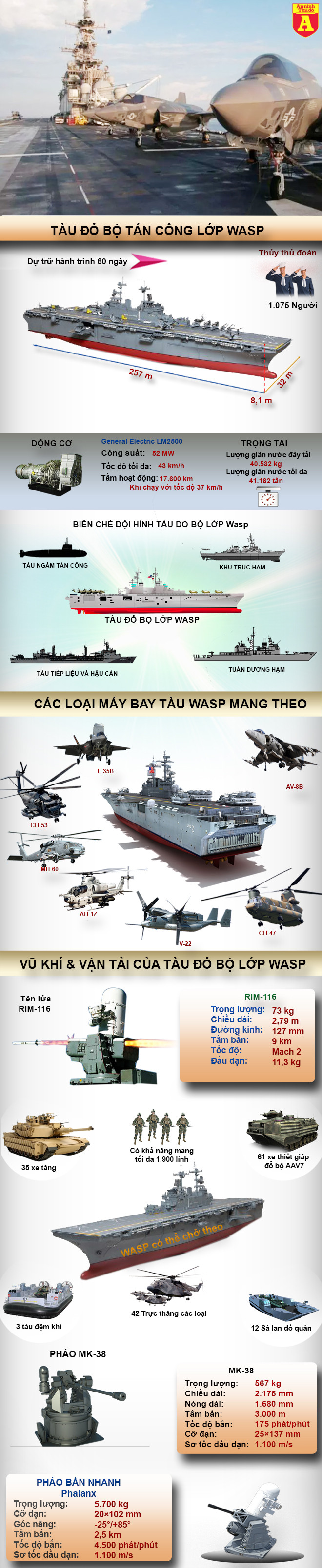 Siêu tàu đổ bộ tấn công USS Wasp của Mỹ được công ty Ingalls Shipbuilding chế tạo dựa trên tàu đổ bộ tấn công (LHA) lớp Tarawa. Con tàu này chính thức được biên chế năm 1989. Với việc được trang bị máy bay chiến đấu F-35B, sức chiến đấu của con tàu này tăng lên rõ rệt. Cùng xem thông số chi tiết loại tàu này qua infographic dưới đây.