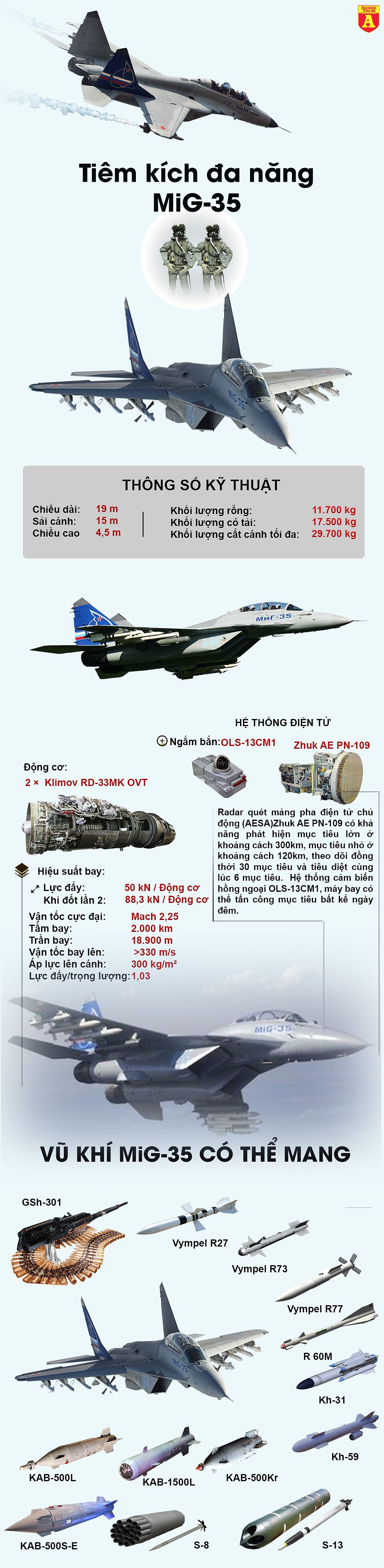 Nga phát triển máy bay Mig-35 từ đầu những năm 2000 với việc tích hợp các công nghệ hàng không hiện đại trên khung thân máy bay chiến đấu đa năng Mig-29. Điểm đáng chú ý là Mig-35 được trang bị hệ thống ra-đa mảng định pha chủ động (AESA) Zhuk-A cải thiện tầm quét, số mục tiêu theo dõi và khả năng hoạt động ở môi trường đối kháng điện tử mạnh.