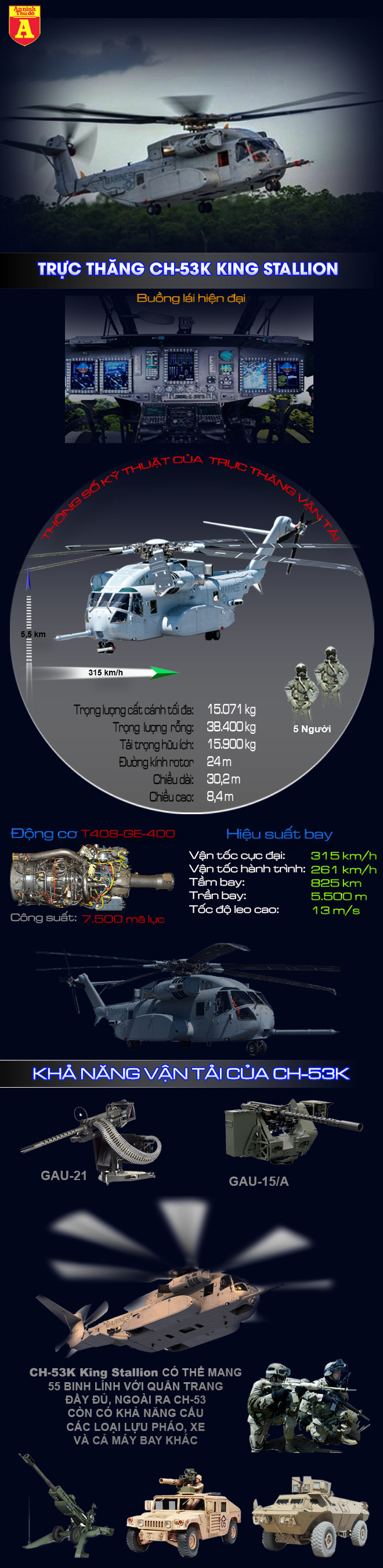 Tải trọng của trực thăng vận tải CH-53K lên tới 15,9 tấn (trong khi CH-53E chỉ là 13,6 tấn) đưa nó trở thành trực thăng vận tải lớn nhất của quân đội Mỹ hiện nay.