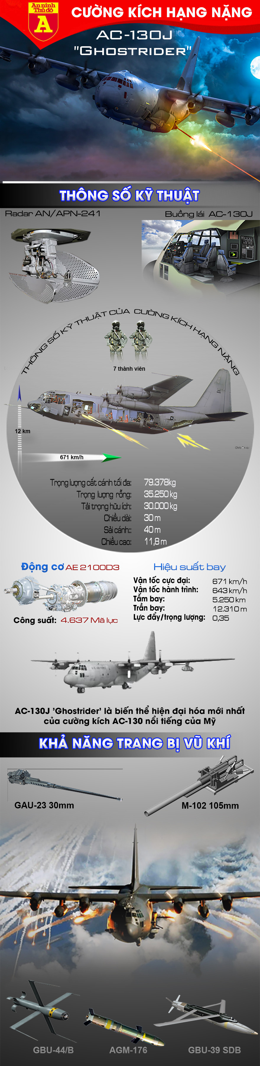 AC-130J Ghostrider là biến thể mới nhất của dòng cường kích lớn nhất hành tinh AC-130. Loại máy bay này vốn được thiết kế sửa đổi từ khung gầm của máy bay vận tải hàng trung C-130J của Mỹ. Hiện không quân Mỹ đang lên kế hoạch trang bị tổng cộng 32 chiếc cường kích này và chúng sẽ được bàn giao toàn bộ vào năm 2021.